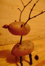 Természetes, hogy Rudit készítjük el: két krumpliból áll a teste, gallyakból a lába, nyaka és agancsa, száras csipkebogyó az orra, és szegfűszeg a szeme. Csak be kell nyomnod az alkatrészeit a krumplikba. A nyakát viszonylag középen bökd a testbe, hogy elbírja a nagy fejét.