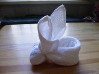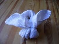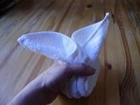 4. Igazgasd el úgy, hogy a nyuszifülek egyformák legyenek, alul a nyuszi két kis pofácskája jól látszódjék, hátul pedig szépen megmaradjon az ajándékkosárka.